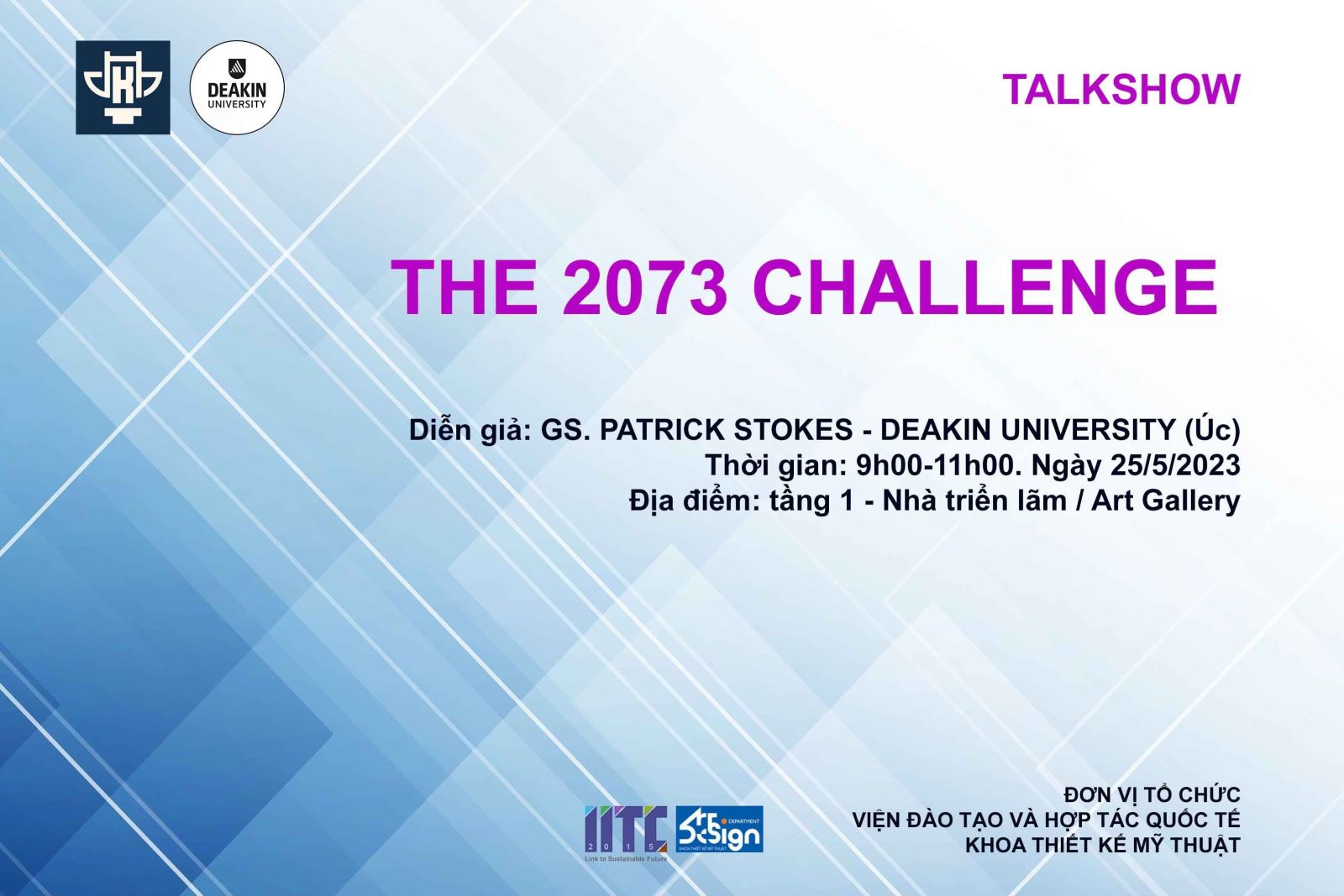 Tiếp nối thành công của các sự kiện hợp tác quốc tế giữa Trường ĐH Kiến trúc Hà Nội và ĐH Deakin (Úc). Viện Đào tạo & Hợp tác quốc tế phối hợp Thiết kế Mỹ thuật - Trường ĐH Kiến trúc Hà Nội tổ chức buổi nói chuyện chuyên đề - Talkshow: “The 2073 Challenge – Thách thức 2073”.