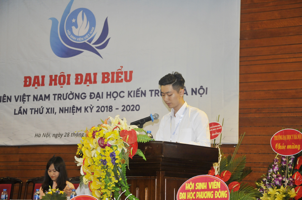 Đại diện Ban chấp hành Hội sinh viên Trường Đại học Kiến trúc Hà Nội, đ/c Nguyễn Văn Huy - Chủ tịch Hội sinh viên Trường (nhiệm kỳ 2018 - 2020) đã lên phát biểu cảm ơn sự quan tâm của lãnh đạo Thành đoàn Hà Nội, Hội sinh viên TP. Hà Nội; sự quan tâm của các thầy cô trong Đảng ủy, Ban giám hiệu Nhà trường dành cho Hội sinh viên và tập thể sinh viên trong Trường; đồng thời lĩnh hội ý kiến chỉ đạo của lãnh đạo Hội sinh viên TP. Hà Nội, Lãnh đạo Nhà trường, xin hứa sẽ quyết tâm thực hiện tốt các mục tiêu, phương hướng của Hội sinh viên Trường, nhiệm kỳ 2018 - 2020 đề ra.