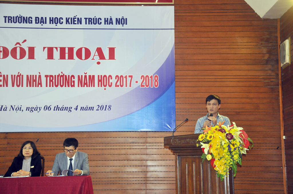 Phát biểu tại buổi đối thoại, PGS.TS.KTS. Lê Quân - Bí thư Đảng ủy, Hiệu trưởng Nhà trường cho biết về tình hình thực tế cũng như những điều kiện về cơ sở vật chất, số lượng sinh viên đang đào tạo, thực trạng của việc đào tạo ... Hiệu trưởng Lê Quân cũng đánh giá cao và biểu dương tinh thần trách nhiệm về những ý kiến trao đổi của sinh viên. Các ý kiến, đề xuất của sinh viên là cơ sở quan trọng để Nhà trường tiếp tục xem xét, điều chỉnh, tìm ra những giải pháp phù hợp nhất trong bối cảnh phát triển mới, nhằm tiếp tục xây dựng Trường Đại học Kiến trúc Hà Nội ngày càng phát triển.