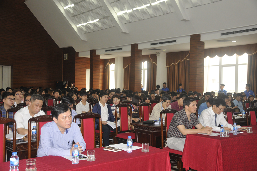 Mở đầu buổi đối thoại, TS. Phạm Đình Khuê - Trưởng phòng Chính trị và Công tác sinh viên báo cáo tình hình học tập của sinh viên trong trường năm học 2018 - 2019 và tổng hợp các câu hỏi và ý kiến của sinh viên.