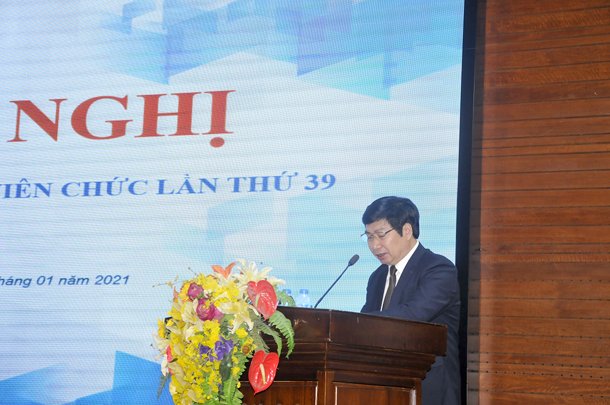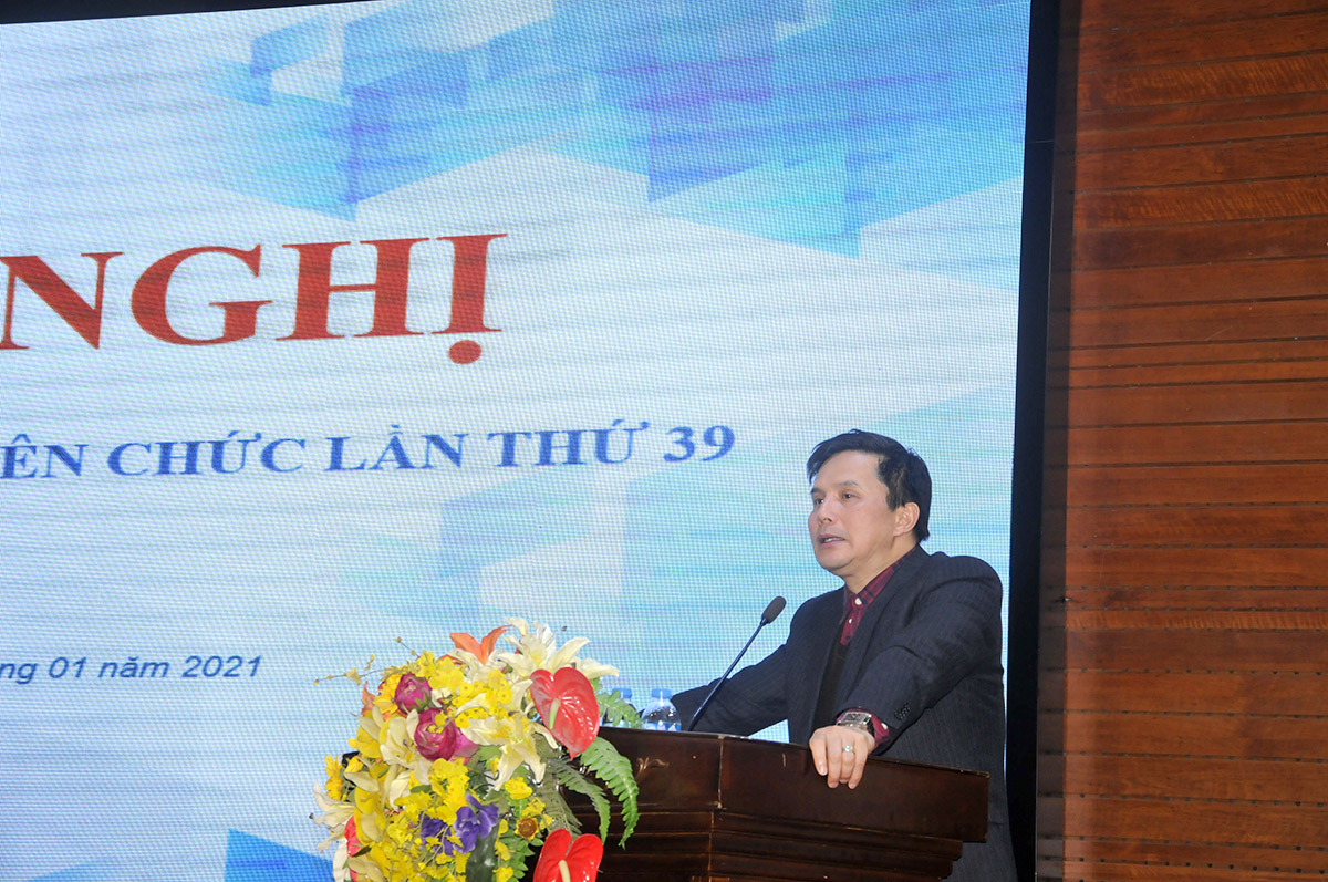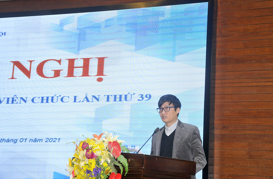 Sau phần khai mạc, Hội nghị đã nghe TS.KTS. Ngô Thị Kim Dung - Phó Bí thư Đảng ủy, Phó Hiệu trưởng Nhà trường, Chủ tịch BCH Công đoàn Trường trình bày Báo cáo kết quả thực hiện nghị quyết Hội nghị đại biểu cán bộ viên chức lần thứ 38 và nhiệm vụ công tác trọng tâm năm 2021. Báo cáo chỉ rõ: “Năm 2020 là năm có nhiều biến động do sự ảnh hưởng của đại dịch Covid-19, tình hình kinh tế - xã hội gặp nhiều khó khăn. Giáo dục nói chung và giáo dục đại học nói riêng đứng trước nhiều khó khăn, thách thức. Dưới sự chỉ đạo, lãnh đạo quyết liệt, sát sao của Chính phủ, các ngành các cấp, của Bộ Xây dựng, Đảng ủy - Hội đồng Trường - Ban giám hiệu, tập thể cán bộ, viên chức, người lao động, người học của Nhà trường đã vận dụng linh hoạt, khắc phục khó khăn, nắm bắt cơ hội, đoàn kết vươn lên hoàn thành chỉ tiêu nhiệm vụ đã đề ra …