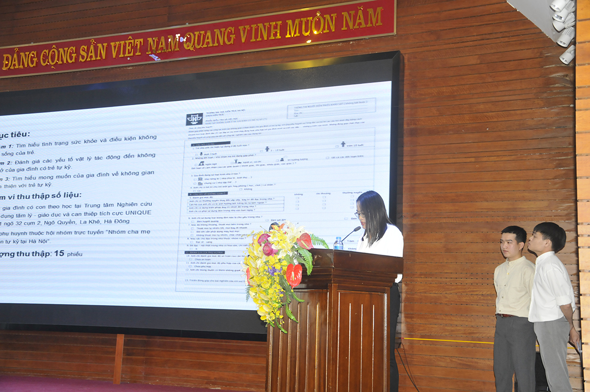 Tại hội nghị, nhóm sinh viên Trần Bá Anh, Trịnh Đăng Hoàng, Hoàng Ngọc Anh – lớp 16K2, Khoa Kiến trúc đã trình bày báo cáo điển hình với đề tài “Đánh giá không gian ở tại gia đình có trẻ tự kỷ”. Đề tài đã được giải Nghiên cứu khoa học sinh viên 2019 - 2020.