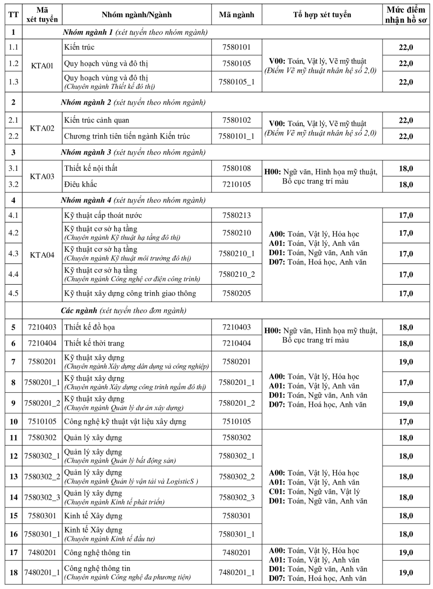 Ngày 02/8/2022, Hiệu trưởng Trường Đại học Kiến trúc Hà Nội đã ký Quyết định số 320/QĐ-ĐHKT-ĐT về việc công bố mức điểm nhận hồ sơ xét tuyển đại học hình thức chính quy Đợt 1 năm 2022 đối với phương thức xét tuyển dựa vào kết quả thi tốt nghiệp THPT năm 2022 và phương thức thi tuyển kết hợp với xét tuyển.