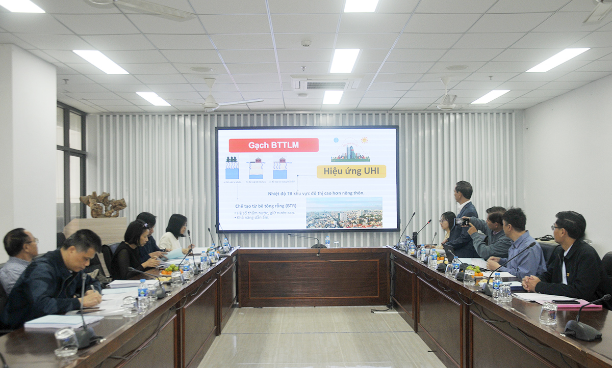 PGS.TS. Nguyễn Duy Hiếu - Chủ nhiệm dự án đã báo cáo tóm tắt nội dung chính của nhiệm vụ bao gồm: Nghiên cứu tổng quan về gạch bê tông tự làm mát; Cơ sở khoa học về gạch bê tông tự làm mát; Tính chất và công nghệ gạch bê tông lát vỉa hè tự làm mát phù hợp với điều kiện Việt Nam; Chế tạo thử nghiệm mẫu gạch bê tông lát vỉa hè tự làm mát và nghiên cứu tính chất của chúng trong phòng thí nghiệm; Xây dựng chỉ dẫn kỹ thuật chế tạo gạch bê tông lát vỉa hè tự làm mát nhằm hạn chế hiệu ứng đảo nhiệt đô thị ở Việt Nam.