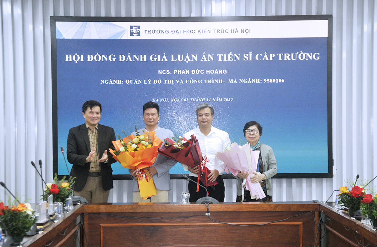 PGS.TS.KTS. Lê Quân, Hiệu trưởng Trường Đại học Kiến trúc Hà Nội, đã gửi lời chúc mừng và kỳ vọng rằng nghiên cứu sinh sẽ vận dụng kết quả nghiên cứu vào công tác thực tiễn để nâng cao hiệu quả công việc chuyên môn.