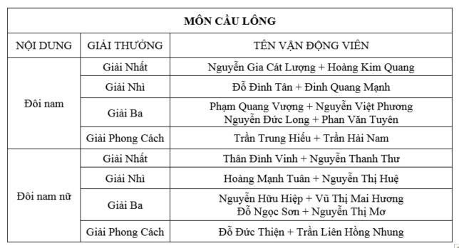 - Bộ môn Cầu lông được chia thành 02 nội dung thi đấu và trao giải: đôi Nam và đôi Nam - Nữ với 03 giải Nhất Nhì Ba và 01 giải Phong cách cho từng nội dung;