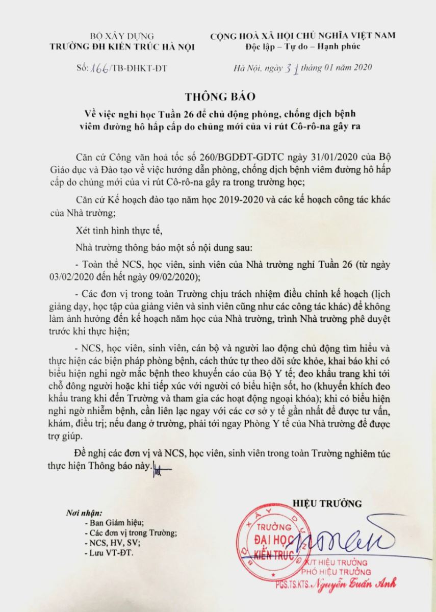 Thông báo V/v nghỉ học Tuần 26 để chủ động phòng, chống dịch bệnh viêm đường hô hấp cấp do chủng mới của vi rút Cô-rô-na gây ra