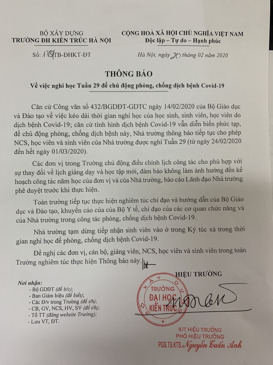 Thông báo V/v nghỉ học Tuần 29 để chủ động phòng, chống dịch bệnh Covid-19