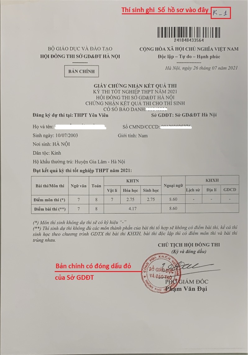 - BẢN CHÍNH Giấy chứng nhận kết quả thi tốt nghiệp THPT năm 2021 (xem hình dưới);