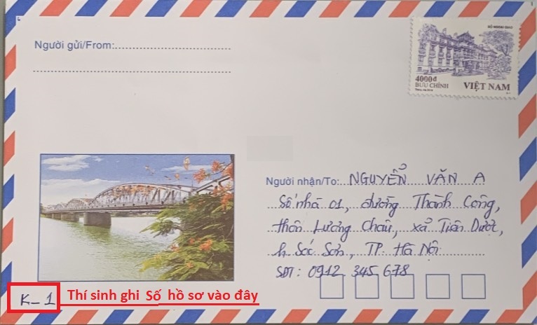 - 01 phong bì dán sẵn tem (xem hình dưới), ghi rõ địa chỉ liên lạc, số điện thoại của thí sinh ở mục người nhận để Nhà trường gửi Thông báo nhập học.