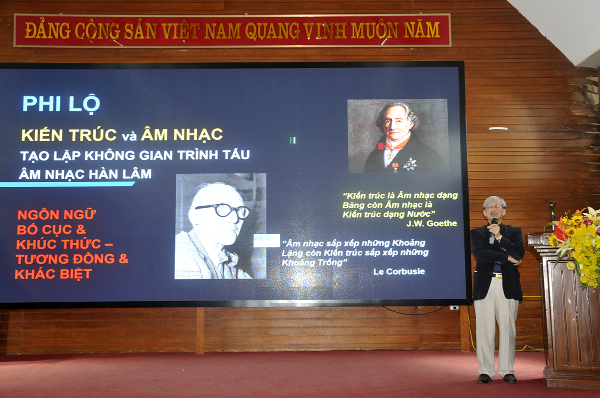 Phát biểu tại buổi Toạ đàm, PGS.TS.KTS. Lê Quân - Hiệu trưởng Nhà trường bày tỏ sự cảm ơn sâu sắc đến TS.KTS. Trần Thanh Bình đã nhận lời mời đến tham dự và làm diễn giả, chia sẻ kinh nghiệm cho các em sinh viên chuyên ngành Kiến trúc Trường Đại học Kiến trúc Hà Nội. Sinh ra và lớn lên trong đại gia đình có truyền thống về âm nhạc, TS.KTS. Trần Thanh Bình là cộng hưởng của âm nhạc và kiến trúc. Kiến trúc Phòng hòa nhạc lớn, Học viện Âm nhạc Quốc gia là một không gian văn hóa đặc thù, nơi kiến trúc chắp cánh cho những vẻ đẹp của âm thanh. Quá trình được bắt đầu từ sự đồng điệu trong ý tưởng của kiến trúc sư thiết kế và những nghệ sĩ biểu diễn. Thông qua kinh nghiệm của những khán phòng nổi tiếng trên thế giới cùng với sự tuân thủ chặt chẽ quy trình thẩm tra âm học theo chuẩn Quốc tế, thính giả sẽ hiểu rõ thêm về cuộc gặp gỡ nơi đây giữa Kiến trúc và Âm nhạc…