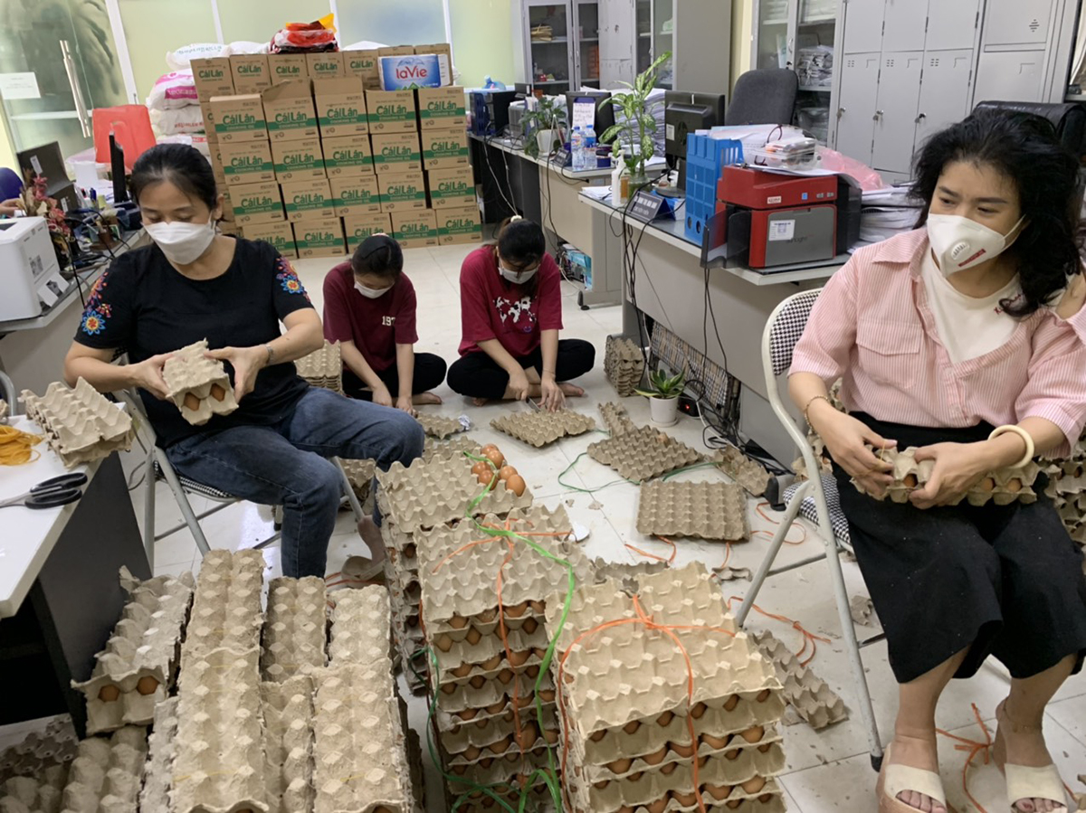 Các thầy cô đang đóng gói lương, thực thực phẩm cho sinh viên