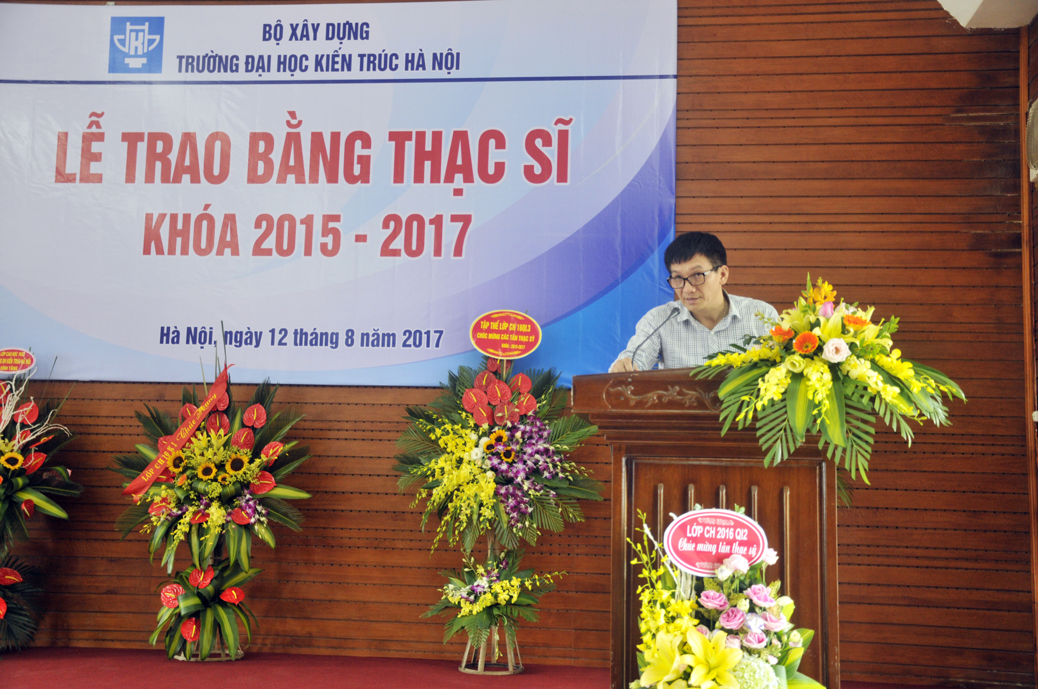 Thay mặt Đảng ủy, Ban giám hiệu Nhà trường, PGS.TS. KTS. Lê Quân - Bí thư Đảng ủy, Hiệu trưởng Nhà trường đã phát biểu và chúc mừng các tân Thạc sĩ. Hiệu trưởng Lê Quân cho biết: “Trong năm qua, được sự quan tâm của lãnh đạo Bộ Xây dựng, Bộ Giáo dục và Đào tạo, công tác đào tạo sau đại học của Trường Đại học Kiến trúc Hà Nội đã không ngừng đổi mới, nâng cao chất lượng đào tạo và tiến tới hội nhập Quốc tế. Công tác đào tạo luôn đáp ứng yêu cầu phát triển theo yêu cầu xã hội…”