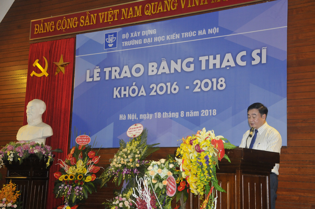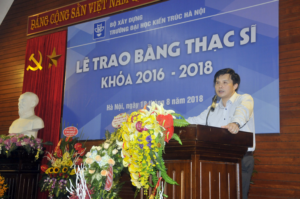 PGS.TS. KTS. Lê Quân - Bí thư Đảng ủy, Hiệu trưởng Nhà trường đã phát biểu và chúc mừng các tân Thạc sĩ. Hiệu trưởng Lê Quân cho biết: “Trong năm qua, được sự quan tâm của lãnh đạo Bộ Xây dựng, Bộ Giáo dục và Đào tạo, công tác đào tạo sau đại học của Trường Đại học Kiến trúc Hà Nội đã không ngừng đổi mới, nâng cao chất lượng đào tạo và tiến tới hội nhập quốc tế. Công tác đào tạo sau đại học của nhà trường đã luôn đáp ứng yêu cầu phát triển của kinh tế xã hội đất nước…”